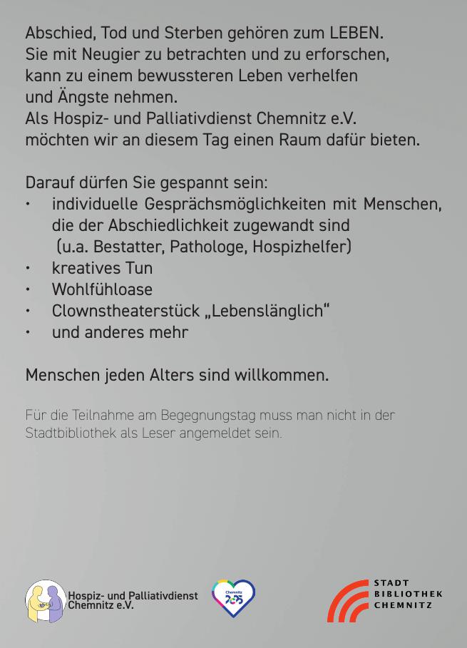 Abschied, Tod und Sterben gehören zum LEBEN. Sie mit Neugier zu betrachten und zu erforschen, kann zu einem bewussteren Leben verhelfen und Ängste nehmen. Als Hospiz- und Palliativdienst Chemnitz e.V. möchten wir an diesem Tag einen Raum dafür bieten. Darauf dürfen Sie gespannt sein:
