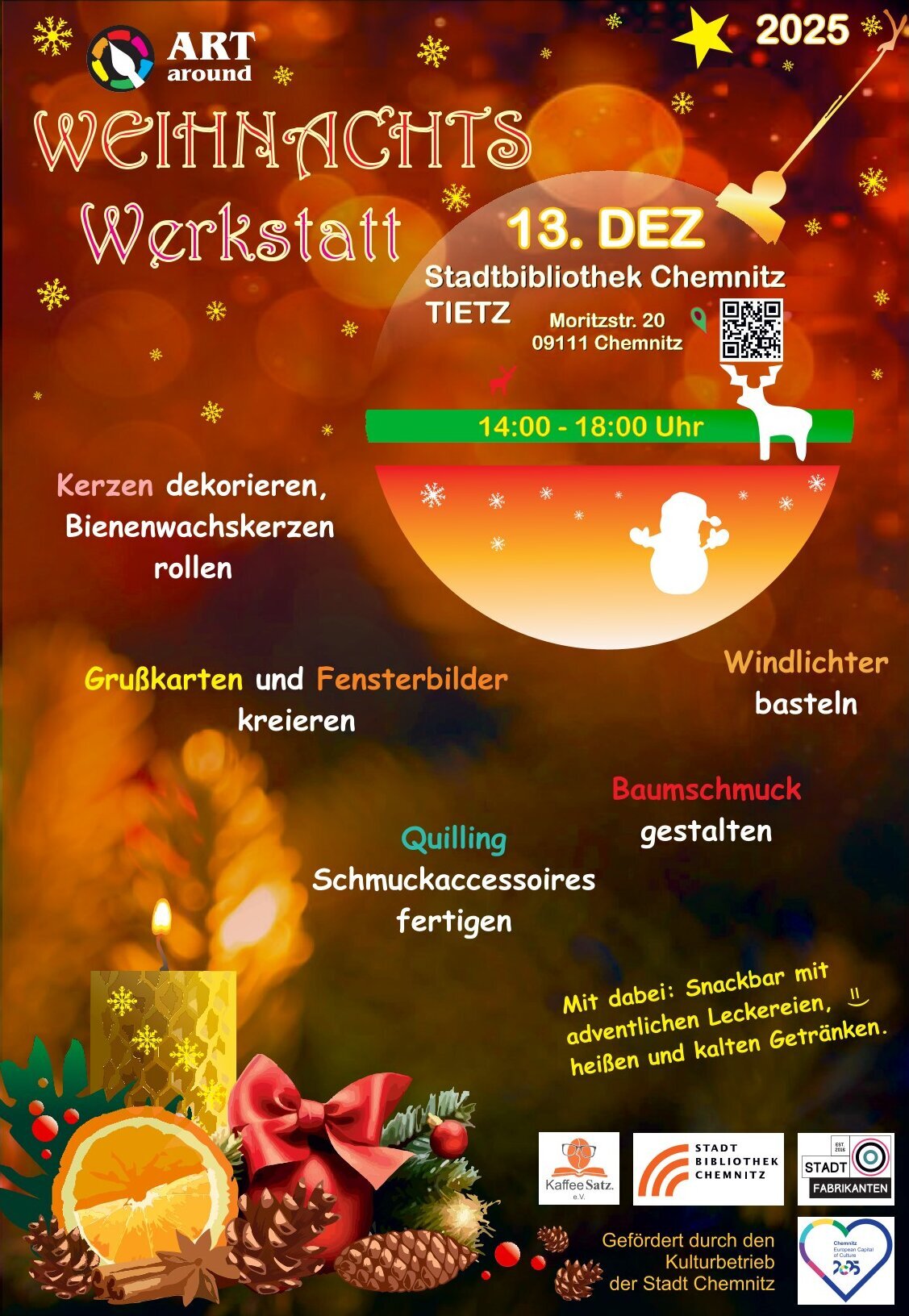Am 13.12.2025 laden wir euch zum gemütlichen Weihnachts-Basteln zu uns in die Bibliothek im TIETZ, ins BibliotheksLabor ein! Von 14 bis 18 Uhr erwartet alle kleinen und großen Künstler ein kreatives Beisammensein, Bastelspaß und weihnachtliche Vorfreude: